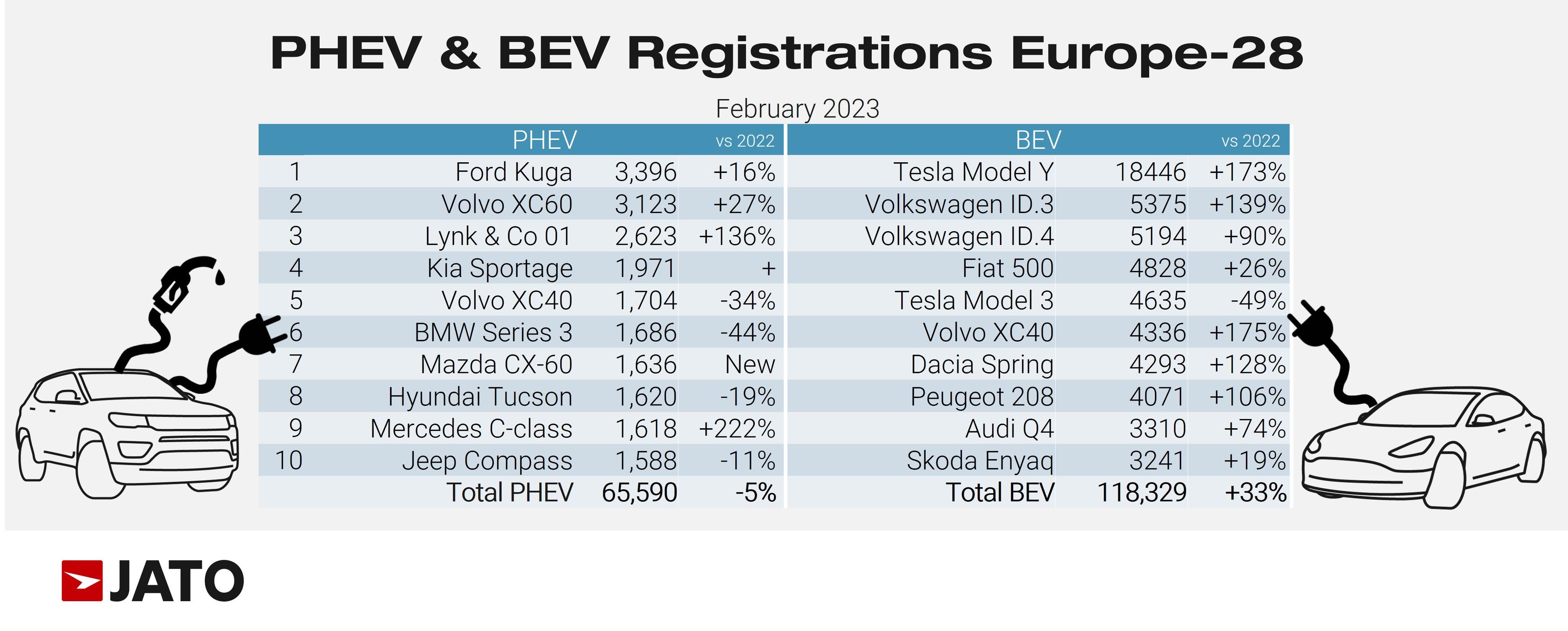 Vendas de 100% elétricos BEV e híbridos plug-in PHEV na Europa em Fevereiro.